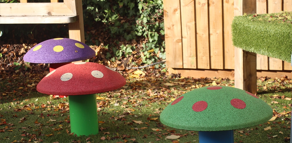 Using a range of materials and features in playground design creates a unique and varied area for nature play and exploration. Organic play features create terrain for dynamic play experiences perfect for physical activity or imaginative, collaborative games. Also, wooden toadstool seating amongst nature can create a thematic meeting point for your nature playground.