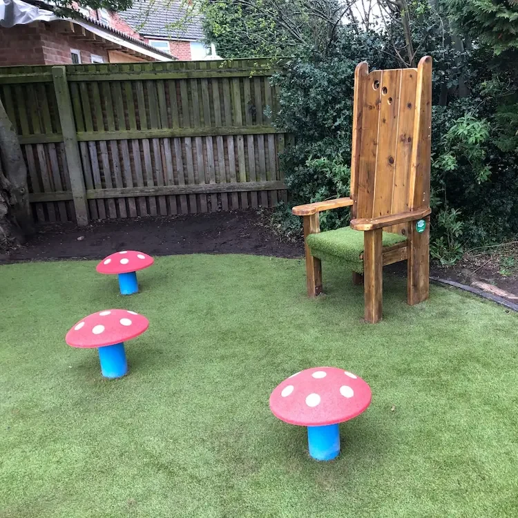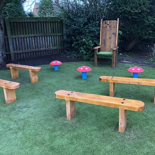 A few months later, after the installation of the playground grass St Joseph’s Catholic Primary School once again asked The School Playground Company to return to the playground to complete its Key Stage 1 Storytelling area. This is because they wanted to add items from its School storytelling furniture range. The School chose A Storytelling Chair, Rubber Topped Colourful Seating Mushrooms, Portable Artificial Grass Topped Seating Cubes and the 1.5m Timber Backless Benches.