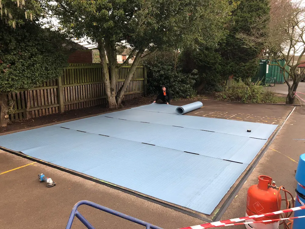 Initially The School Playground Company were chosen to lay its 24mm Pile High Play Grass, with cushioning 10mm roll out shock-pad and wheelchair friendly ramped rubber edging detail, to fix down on the existing tarmac playground surface.