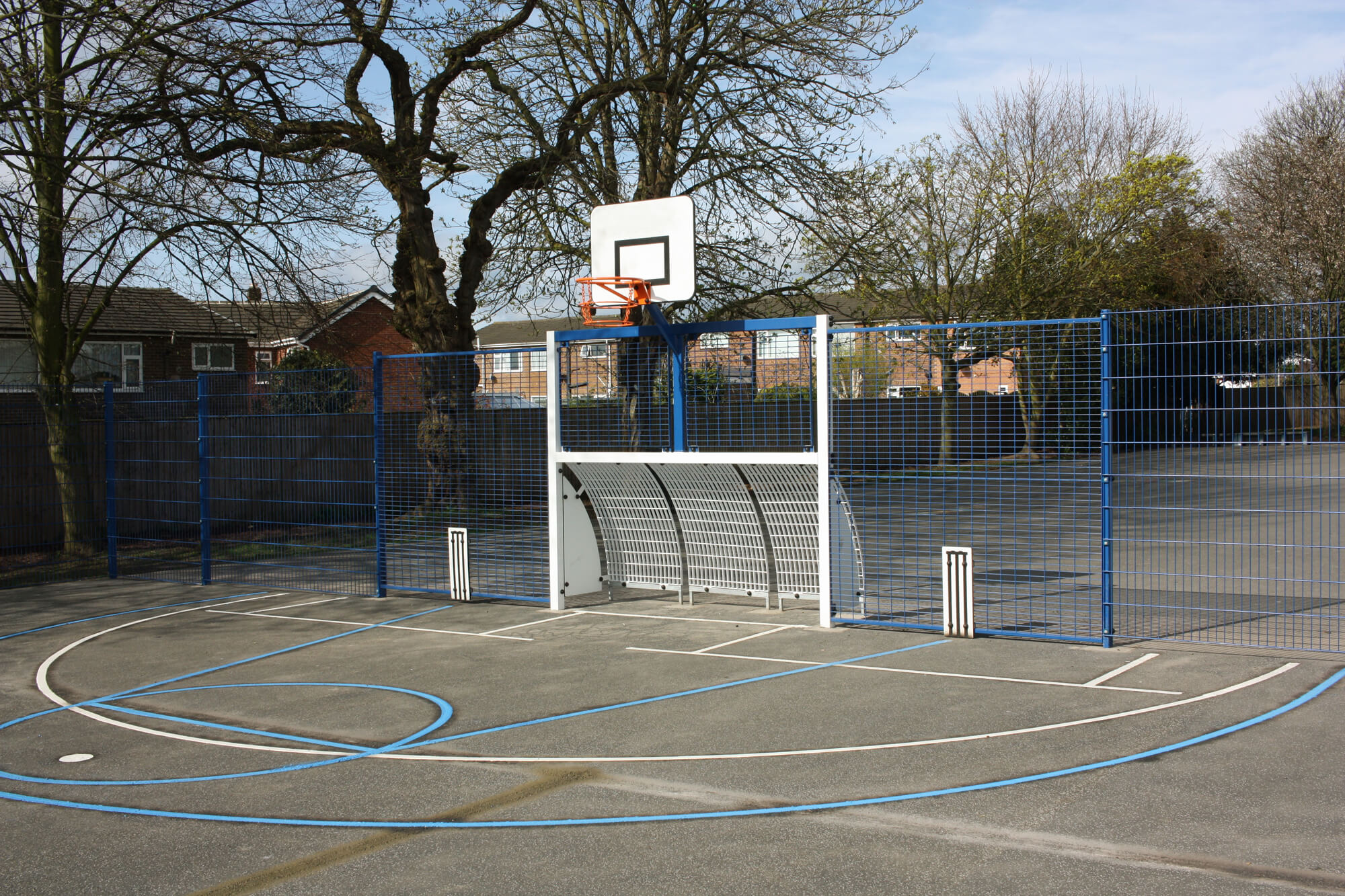 MUGAs come with a variety of nets, goals, and hoops suitable for a range of sports. To save space on the MUGA and not to overcomplicate the court, these goals are combined, inset into the fencing for a secure sports experience.