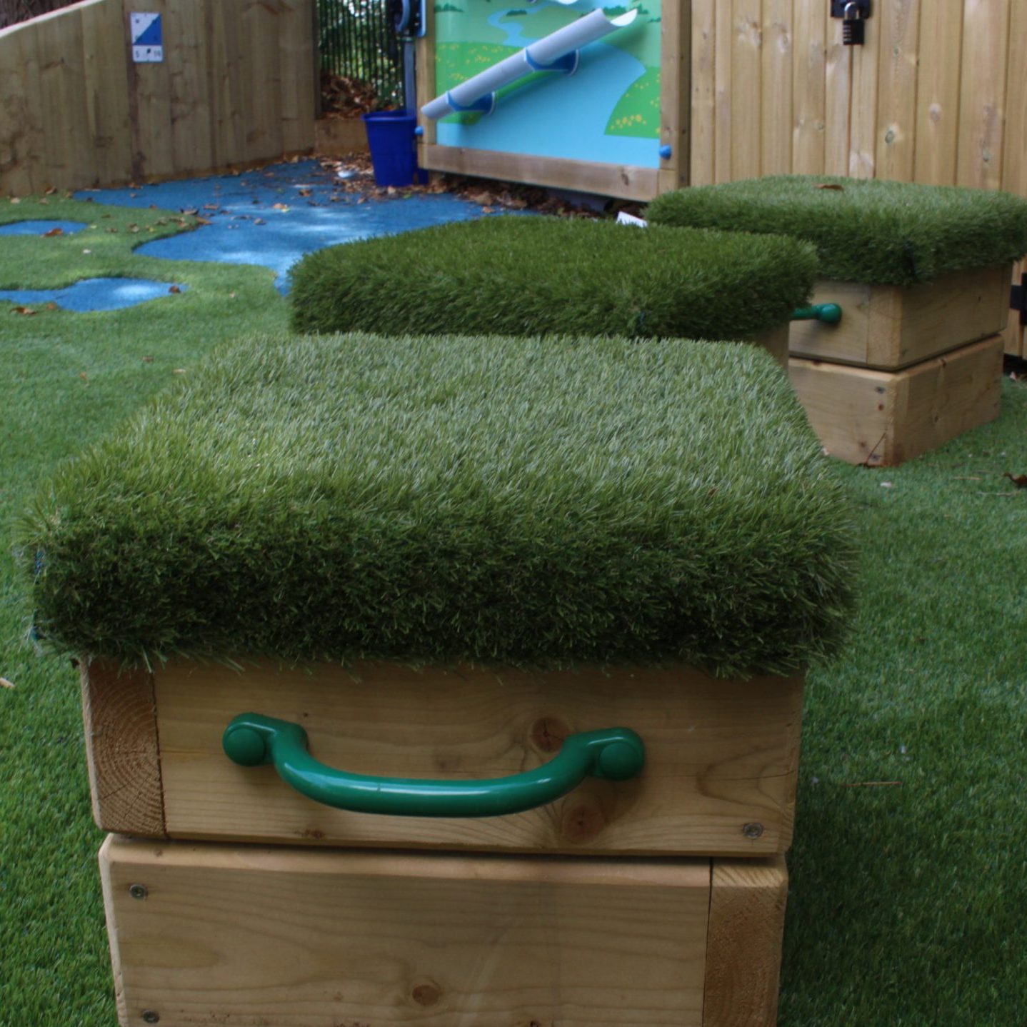 Create a unique story circle with four portable cube seats designed for comfort and usability. The wooden cubes are easy to store and very durable. The texture of artificial grass on the tops of the cubes creates a sensory seat that kids love. All while giving the area a natural look matching the wooden storytelling chair.
